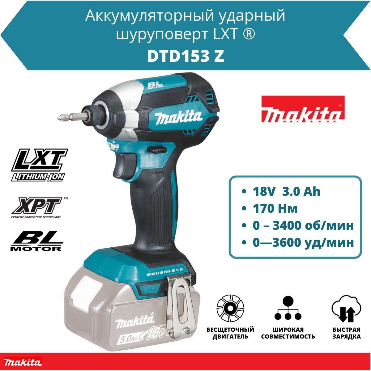 Аккум. шуруповерт MAKITA DTD 153 Z в кор. (18.0 В, БЕЗ АККУМУЛЯТОРА, 1 скор., 170 Нм, шурупы до 13 мм)